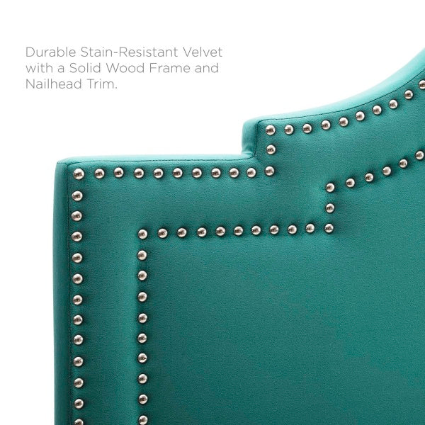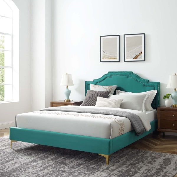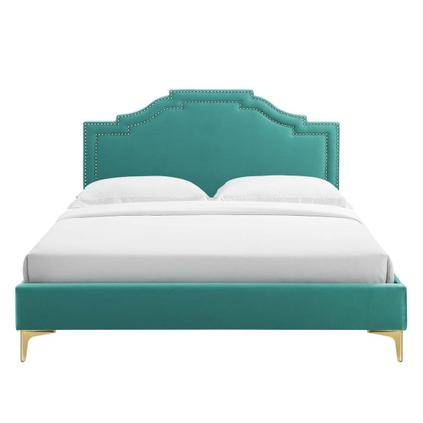 Introduce glam deco style and luxe sleep in a master bedroom or guest suite with the Adelaide Performance Velvet King Platform Bed. This king bed frame is complemented by the king headboard with a double trim of nailheads and unique arched shape. Resting atop gold metal legs, this upholstered bed is covered in stain-resistant performance velvet with dense foam padding to offer comfort and support while sitting up in bed. This king size bed frame is a sturdy mattress foundation for memory foam, innerspring, latex, and hybrid mattresses. With supporting legs and a reinforced center beam, this upholstered bed is complete with a poplar wood slat support system that offers lasting stability. Mattress not included. Assembly required. Weight Capacity: 800 lbs. Set Includes: One - Adelaide Performance Velvet King Platform Bed