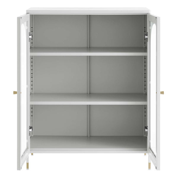 Crafted from powder-coated cold-rolled steel plates, this storage cabinet offers durability and modern appeal. The cabinet features two height-adjustable shelves, glass-front doors with arched details, and copper-plated zinc alloy handle pulls.