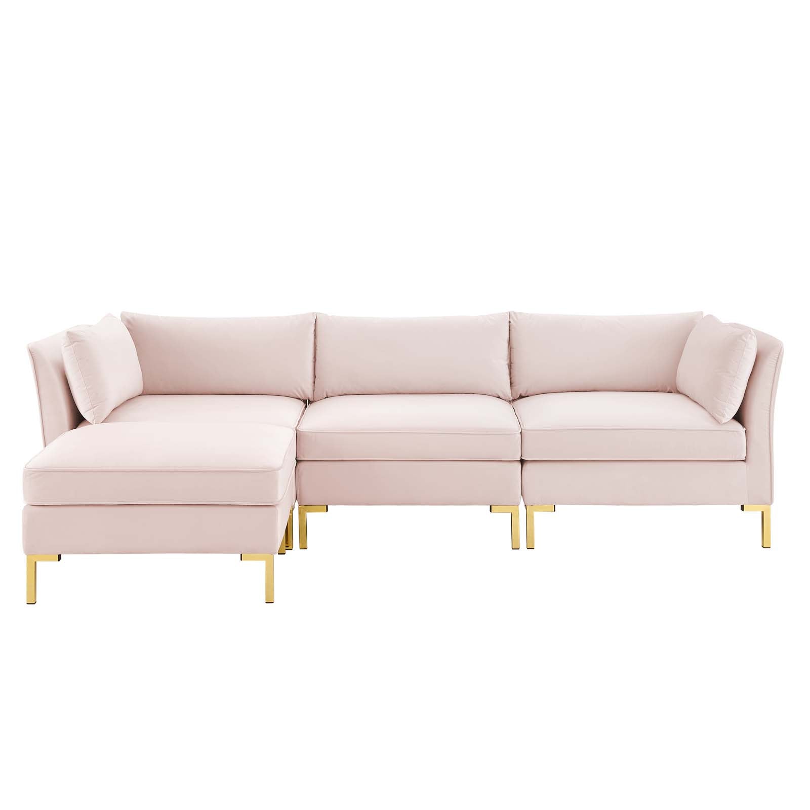 Introduce vintage modern and glam deco styles to your living space with the Ardent Performance Velvet 4-Piece Sectional Sofa. With luxe velvety texture and classic French piping, Ardent refreshes homes, apartments, and office spaces. This sectional sofa collection that allows for a variety of configurations to suit any living room, bedroom, office space, or lounge area while hidden connection buckles offer a secure fit. Covered in stain-resistant performance velvet, this sofa features dense foam padding and a sinuous spring support system for a premium seating experience. The velvet sectional sofa sits on gold metal legs with non-marking foot caps to protect your flooring. Weight Capacity for Each Sectional Sofa Piece: 440 lbs.
