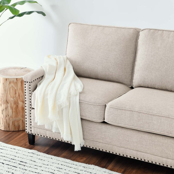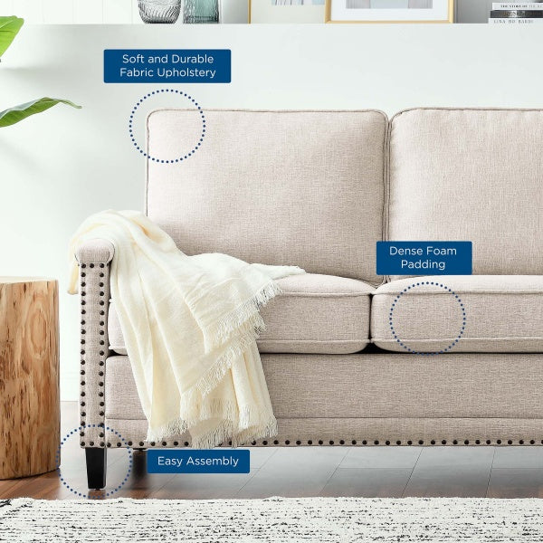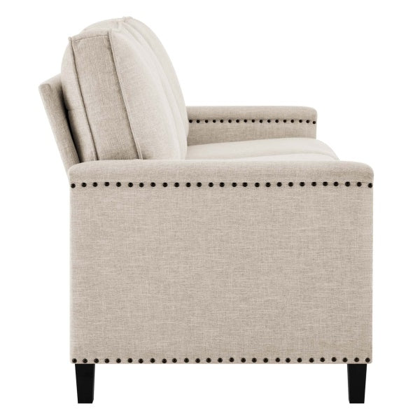 Perfect for the living room, bedroom, office, or lounge area, this sofa is enriched with a tailored profile, separate seat cushions, and a classic nailhead trim. Upholstered in polyester fabric, this living room sofa is padded with dense foam and complete with a spring pocket support system to offer a premium seating experience.