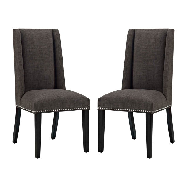 Explore the vast riches of a treasured heritage with the Baron Dining Chair. Designed to resonate elegance, Barons features a charming back and polished nailhead trimmed seat with a dash of grace and noble appeal. Complete with dense foam padding, fine fabric upholstery, solid wood frame and legs with non-marking foot glides, Baron is a stylish dining chair perfect for the modern home. Set Includes: Two - Baron Dining Chair