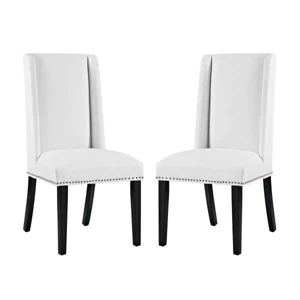 Explore the vast riches of a treasured heritage with the Baron Dining Chair. Designed to resonate elegance, Barons features a charming back and antique copper nailhead trimmed seat with a dash of grace and noble appeal. Complete with dense foam padding, fine vinyl upholstery, solid wood frame and legs with non-marking foot glides, Baron is a stylish dining chair perfect for the modern home. Set Includes: Two - Baron Dining Chair