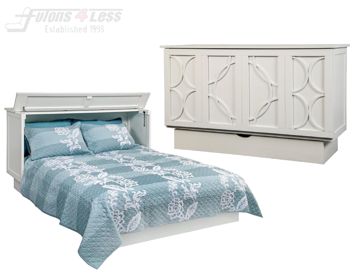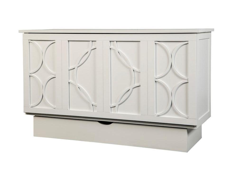 The bold circular molding design on the Brussels is inspired by 18th century European furniture. This stunning cabinet bed comes in three finishes: Ash, White and Charcoal Grey. The white features a premium paint finish. The ash is a pickeled finish on Acacia veneer that shows natural wood features. The charcoal grey finish has variations in the hand applied silvery gray stain.