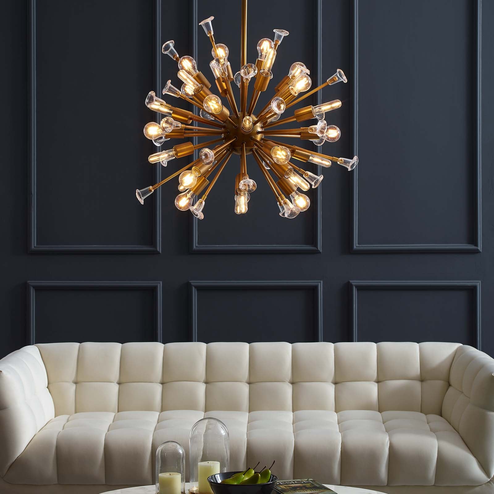 Send warm streams of light across the living room, bedroom, entryway, or dining room with the Burst Pendant Chandelier. Dazzling guests with a unique starburst design, this pendant chandelier features an array of antique brass metal rods and sockets that shoot out from its spherical center at varying lengths. An eye-catching conversation piece with calla lily shaped transparent plastic rod endings, this ceiling light fixture modernizes mid-century style with contemporary sculptural form. Burst hangs suspended from a sleek metal rod and flush wall mount and requires thirty E26 25W light bulbs (not included).