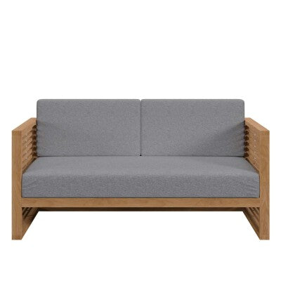 Enjoy warm weather and spirited conversation with the Carlsbad Teak Wood Outdoor Patio Furniture Set. A bold statement on the porch, in your backyard, or poolside, this patio set abounds in contemporary style with a slatted, clean-lined design. Ideal for al fresco entertaining or relaxing by the pool, the Carlsbad Outdoor Patio Furniture Collection is crafted with durable Premium Grade A teak wood and complete with comfortable cushions covered in machine washable sun, stain, water, and fade resistant Sunproof® fabric covers. Includes non-marking plastic foot glides. Patio Set Includes: Loveseat, Armchair, Coffee Table Set Includes: One - Carlsbad Armchair One - Carlsbad Coffee Table One - Carlsbad Loveseat