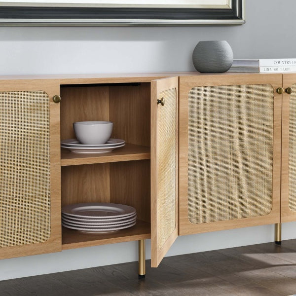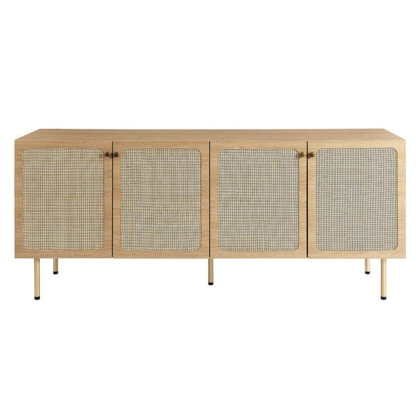 Featuring beautiful rattan weaving on the doors, this credenza updates a living room, entryway, dining room, hallway, bedroom, or lounge area. A spacious shelving area hidden behind the hinged doors offers ample storage space for linens, home decor, china, silverware, barware, and more.