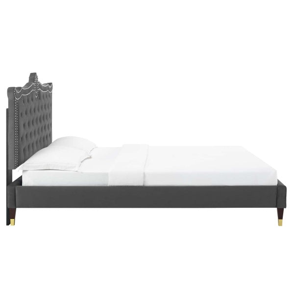 Elevate your master bedroom or guest bedroom decor with the opulent style and glam deco elegance of the Clara Tufted Performance Velvet Queen Platform Bed. Featuring classic button tufting, nailhead detail, and an ornate silhouette, the queen headboard of this platform bed is rich in velvety texture and royal charm. Resting atop wood legs with gold metal sleeves, this platform bed is covered in soft, stain-resistant performance velvet with a padded headboard for supportive comfort while sitting up in bed. This queen size bed frame is a sturdy mattress foundation for memory foam, innerspring, latex, and hybrid mattresses. With supporting legs and a reinforced center beam, this upholstered bed is complete with a poplar wood slat support system that offers lasting stability. Mattress not included. Assembly required. Queen Bed Frame Weight Capacity: 800 lbs. Set Includes: One - Clara Performance Velvet Queen Platform Bed