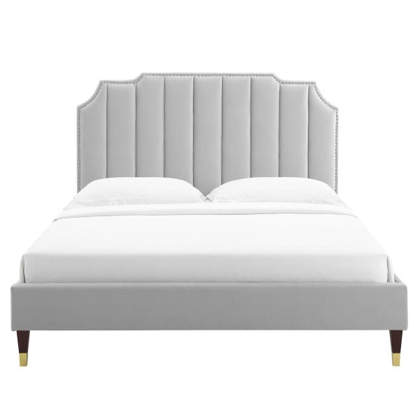 The perfect addition to a guest bedroom or teenager's room, the Colette Performance Velvet Full Platform Bed is rich in glam deco style and elegant elements. Bringing luxe intrigue to the bedroom, the velvet headboard of this full size bed features classic nailhead trim, channel tufting, and a unique silhouette. The upholstered bed is covered in soft, stain-resistant performance velvet with dense foam on the headboard to offer a supportive comfort while sitting up in bed reading, relaxing, or watching TV. Eliminating the need for a box spring, the MDF frame of this full bed is complete with a wood slat support system crafted with poplar for lasting durability and support. This slatted bed frame rests on wood legs with gold metal sleeves and non-marking foot caps and includes a reinforced center beam with two support legs for enhanced stability making it a sturdy mattress foundation for memory foam, innerspring, latex, and hybrid mattresses. Assembly required. Weight Capacity: 800 lbs. Set Includes: One - Harlow Full Platform Bed Frame One - Rosalind Performance Velvet Full/Queen Headboard