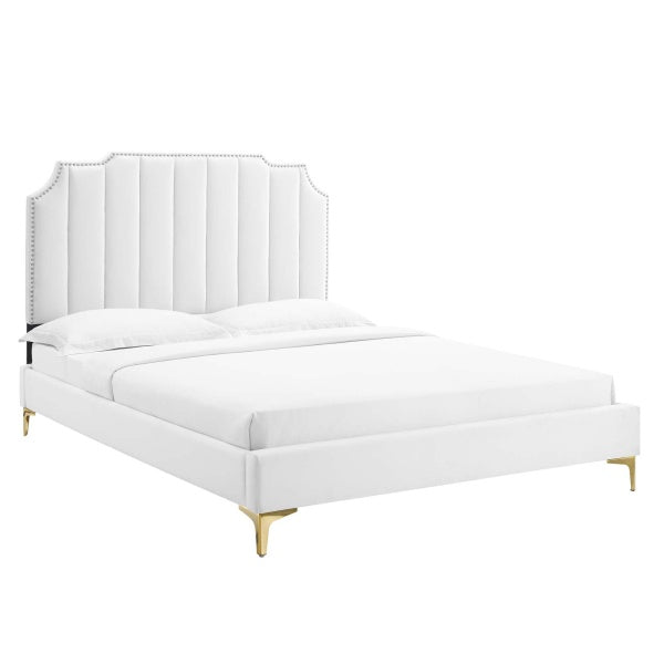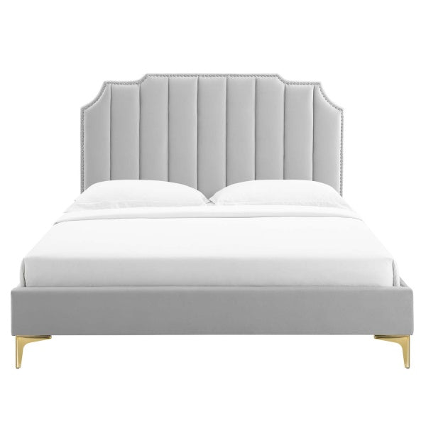 The perfect addition to a master bedroom or guest bedroom, the Colette Performance Velvet King Platform Bed is rich in glam deco style and elegant elements. Bringing luxe intrigue to the bedroom, the velvet headboard of this king size bed features classic nailhead trim, channel tufting, and a unique silhouette. The upholstered bed is covered in soft, stain-resistant performance velvet with dense foam on the headboard to offer a supportive comfort while sitting up in bed reading, relaxing, or watching TV. Eliminating the need for a box spring, the MDF frame of this king bed is complete with a wood slat support system crafted with poplar for lasting durability and support. This slatted bed frame rests on gold metal legs with non-marking foot caps and includes a reinforced center beam with two support legs for enhanced stability making it a sturdy mattress foundation for memory foam, innerspring, latex, and hybrid mattresses. Assembly required. Weight Capacity: 800 lbs. Set Includes: One - Rosalind Performance Velvet King/California King Headboard One - Sutton King Bed Frame