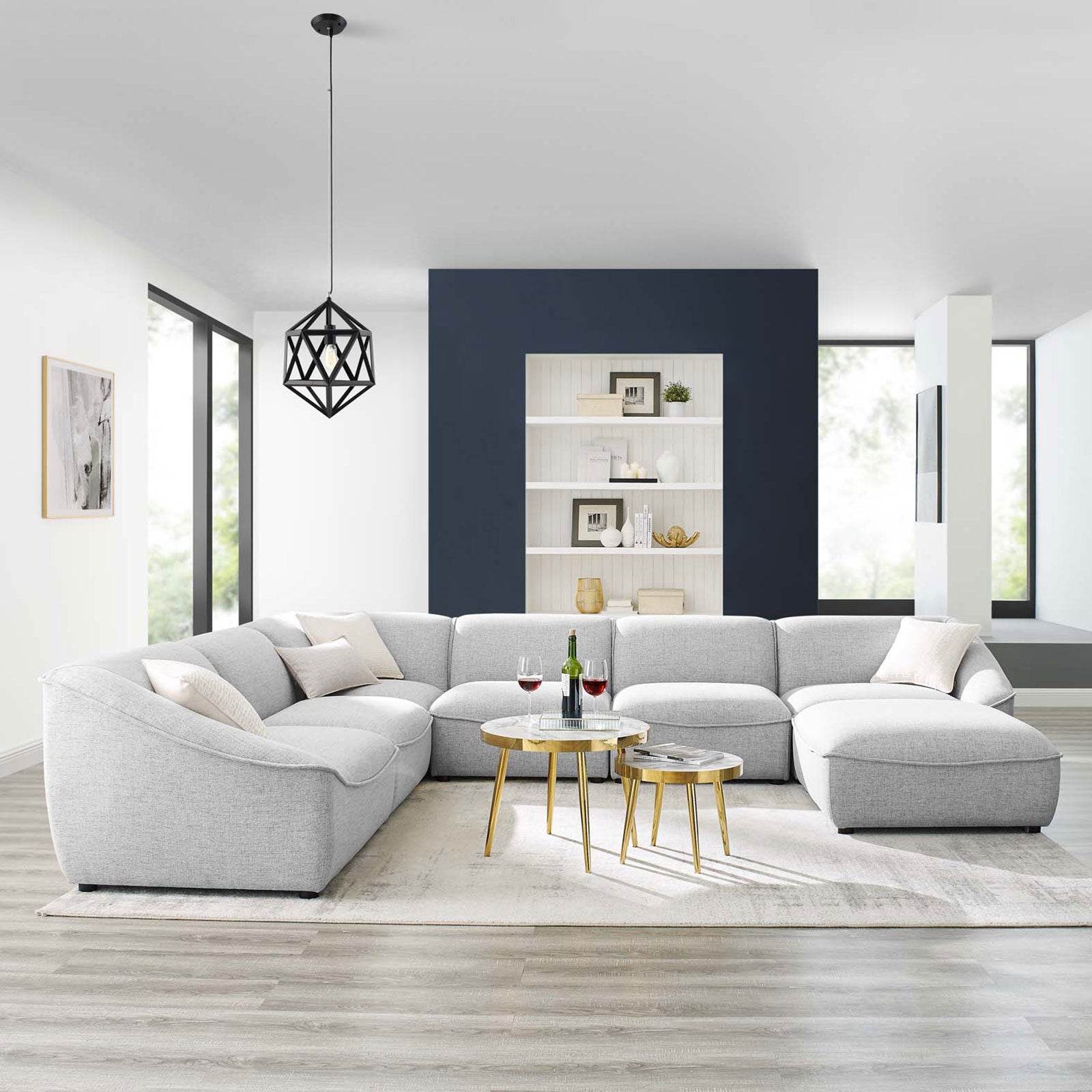 Indulge in cozy relaxation in the comfort of your own home with the Comprise Upholstered 7-Piece Sectional Sofa. A casual design accented with French piping details, this sectional sofa features dense foam padding, soft polyester upholstery and a pocket coil spring system to offer a premium seating experience. Solidly constructed with solid wood and plywood, this upholstered sofa rests atop sturdy rubberwood legs with secure connectors between modular pieces. Create a custom living room or lounge area with the Comprise Living Room Furniture Collection.