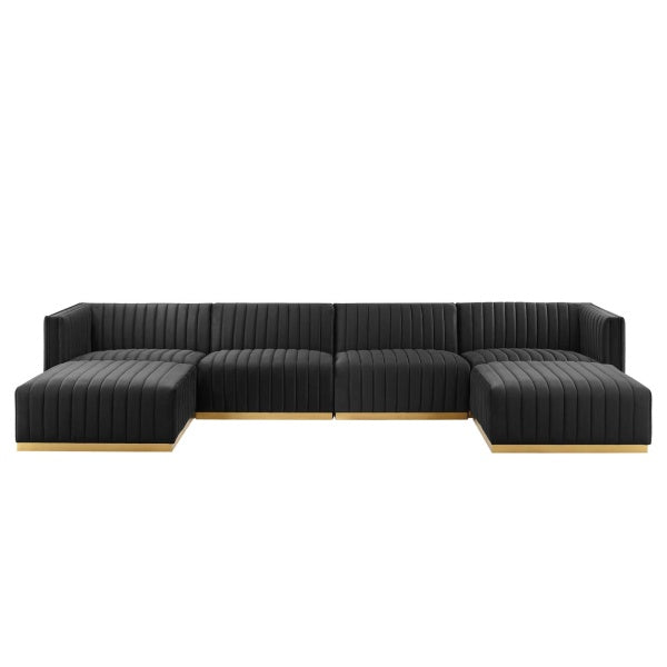 Modern appeal surrounds the Conjure Channel Tufted Performance Velvet Upholstered 6-Piece Sectional Sofa. Luxuriously soft, stain-resistant performance velvet upholstery covers dense foam padding and an individually wrapped spring coil system for a supportive living room sofa that will become the go-to lounge spot for family and friends. Vertical channel tufting and subtle French piping adds depth to this vintage inspired sectional sofa that effortlessly becomes the focal point in your living room. Solidly constructed from wood and plywood, this sofa features non-marking foot caps and boasts a brushed gold stainless steel base. Versatile and elegant, this sectional sofa is ideally suited for a variety of decor styles in your living room, lounge, or home office. Each Seat Weight Capacity: 331 lbs. Set Includes: One - Conjure Channel Tufted Left-Arm Chair One - Conjure Channel Tufted Right-Arm Chair Two - Conjure Channel Tufted Armless Chair Two - Conjure Channel Tufted Ottoman