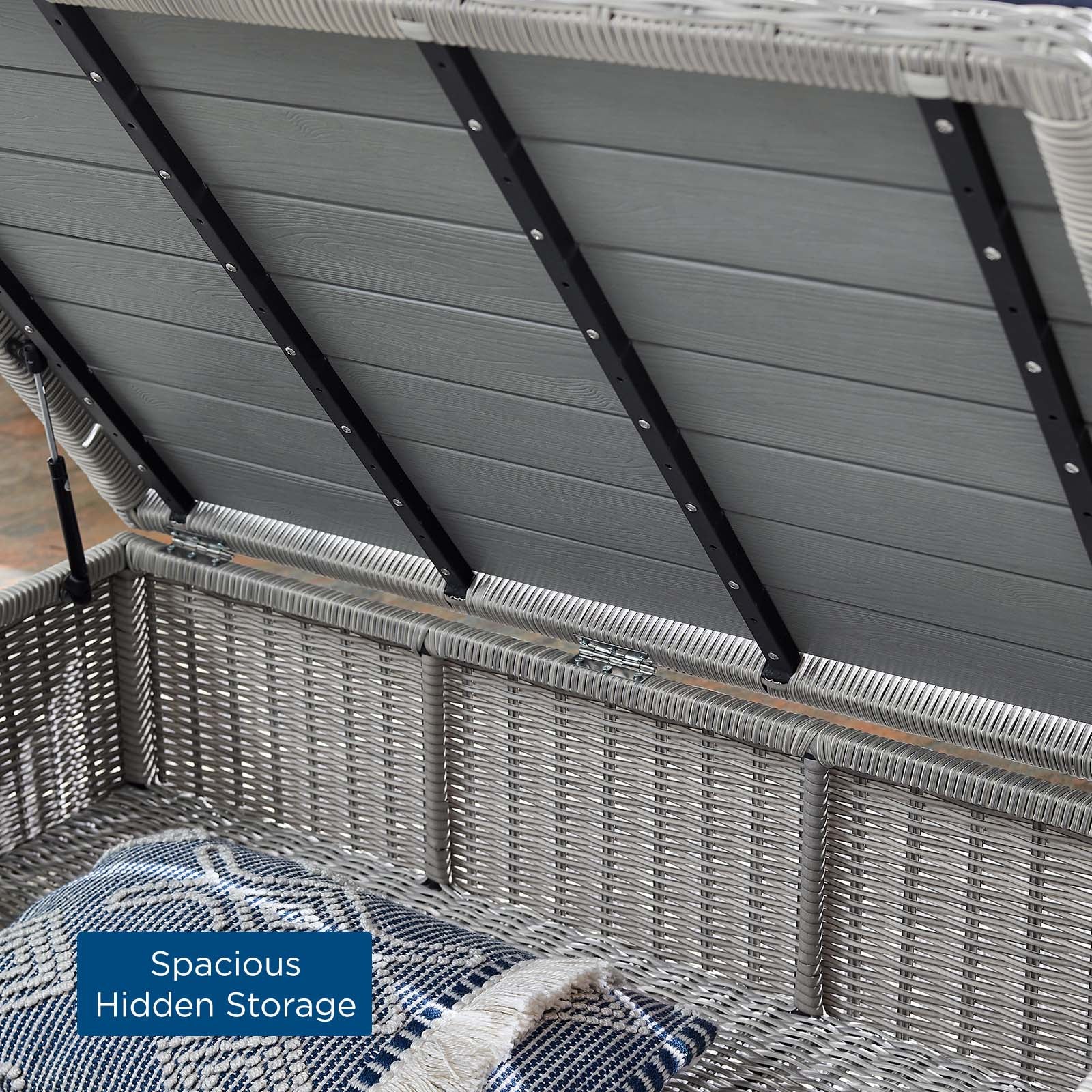 Enjoy fresh air and alfresco relaxation with the Conway Outdoor Patio Wicker Rattan 4-Piece Furniture Set. Wrapped in UV-resistant light gray synthetic wicker rattan, this patio furniture set boasts organic texture and a neutral hue that brings a calming presence to your outdoor space. The frames of this outdoor furniture set are crafted with durable powder-coated aluminum and rest on L-shaped legs with plastic foot glides. Thick foam padded cushions covered with removable, all-weather polyester fabric covers offer a comfortable seat and affix securely to the lounge chair with cord tension attachments. Trending aesthetics and a classic design define this outdoor patio furniture collection making it a beautiful addition to any outdoor space including the backyard, patio, porch, balcony, or poolside. Assembly required. Set Includes: Sofa, 2 Armchairs, Storage Coffee Table Set Includes: One - Conway 45" Coffee Table One - Conway Sofa Two - Conway Armchair