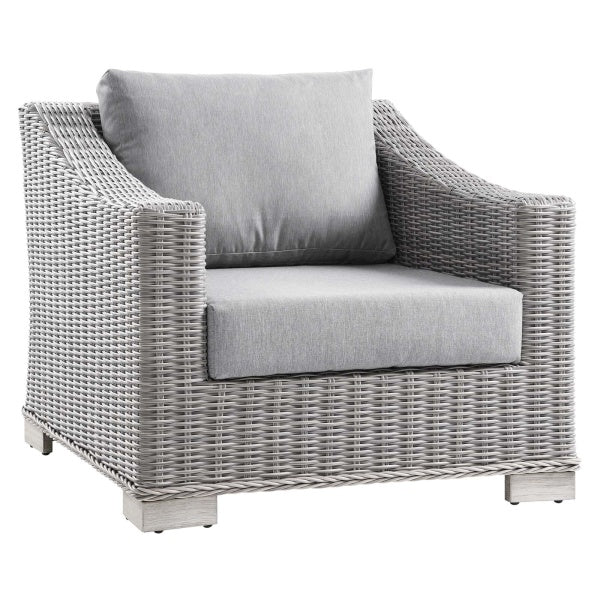 Enjoy fresh air and alfresco relaxation with the Conway Outdoor Patio Wicker Rattan 4-Piece Furniture Set. Wrapped in UV-resistant light gray synthetic wicker rattan, this patio furniture set boasts organic texture and a neutral hue that brings a calming presence to your outdoor space. The frames of this outdoor furniture set are crafted with durable powder-coated aluminum and rest on L-shaped legs with plastic foot glides. Thick foam padded cushions covered with removable, all-weather polyester fabric covers offer a comfortable seat and affix securely to the lounge chair with cord tension attachments. Trending aesthetics and a classic design define this outdoor patio furniture collection making it a beautiful addition to any outdoor space including the backyard, patio, porch, balcony, or poolside. Assembly required. Set Includes: Sofa, 2 Armchairs, Storage Coffee Table Set Includes: One - Conway 45" Coffee Table One - Conway Sofa Two - Conway Armchair