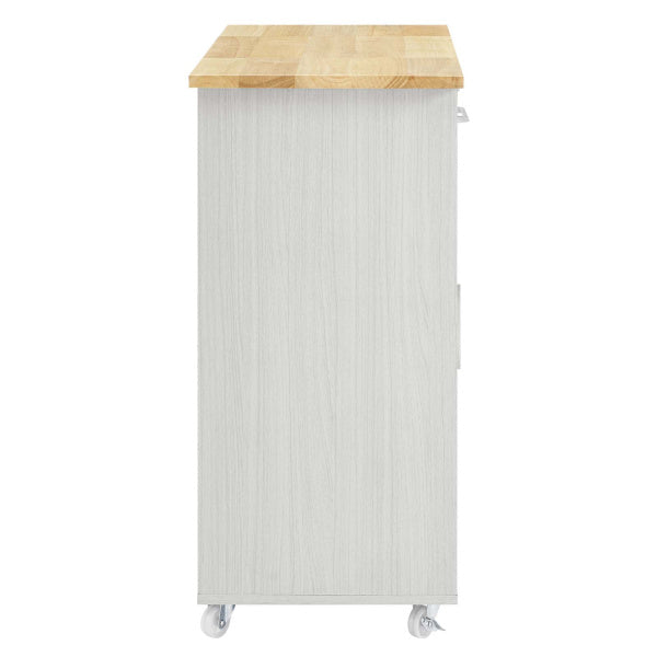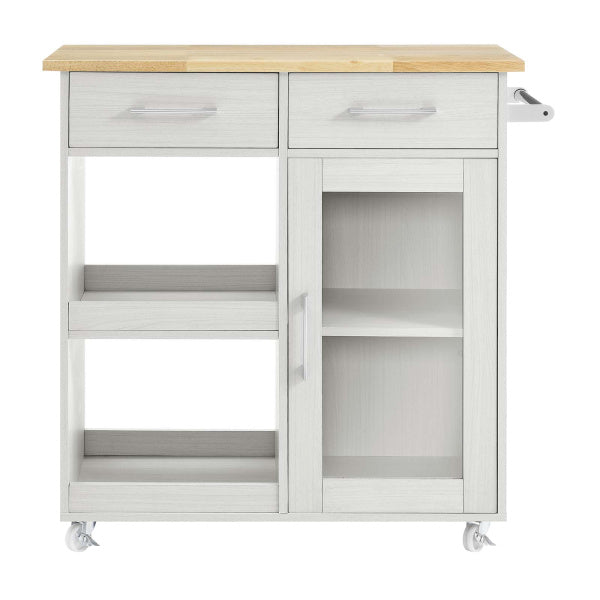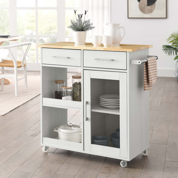 Organize your kitchen essentials effortlessly with two open shelves, two storage shelves behind a hinged glass-front door, and two full-glide drawers. From small appliances to pots, pans, and cooking utensils, this cart provides ample storage space to keep your kitchen neat and tidy. This kitchen cart features a convenient towel bar on the side.