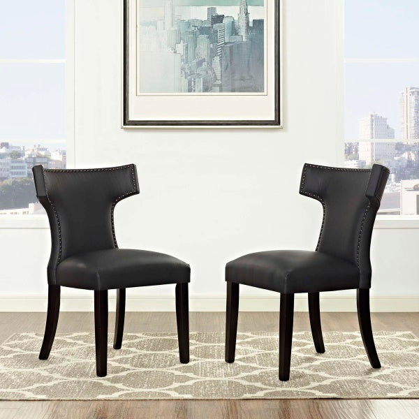 Transform your dining décor with the broadly designed Curve Dining Side Chair. Sweeping lines complement a minimalist shape for a chic look studded with nailhead trim. Curve comes generously padded with dense foam covered in vinyl, non-marking foot caps, and delivers just the right touch of finesse with tapered wood legs. Sporting an hourglass shape, Curve works well in a variety of dining room arrangements.