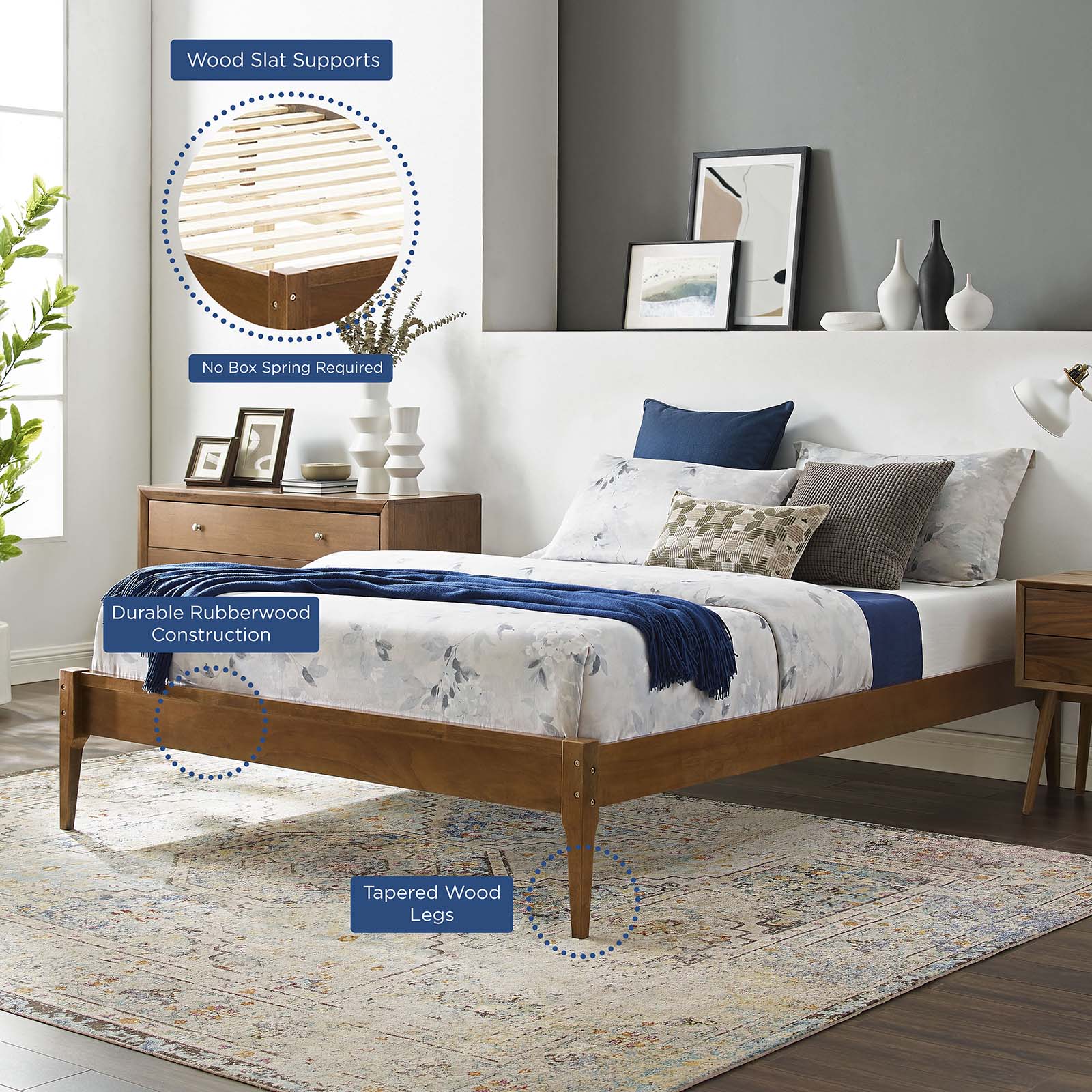 Refresh your bedroom with modern style and updated comfort with the June King Platform Bed. Inspired by mid-century design, this king size bed frame boasts retro detail with contemporary accents and organic aesthetics to bring trending modernity to your master bedroom or guest room. This platform bed frame is a sturdy addition to the bedroom with a durable wood, MDF, and veneer construction and four tapered rubberwood legs. Eliminating the need for a box spring, this king bed is complete with a wood slat support system, reinforced center beam, and supporting legs that make it a lasting mattress foundation for memory foam, latex, innerspring, and hybrid mattresses.