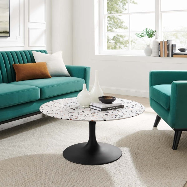 Reflecting a seamless organic shape and timeless form, the Lippa Coffee Table has become a symbol of modernism for over 60 years. Before its release, homes were filled with clunky remnants of an industrial age long gone by. But in order to advance into the new world, homes first had to transition from the traditional square table, into a piece that connoted progress. The base and dimensions are true to the original specifications, while the table’s round terrazzo top rests on a metal tapered base with a glossy finish.