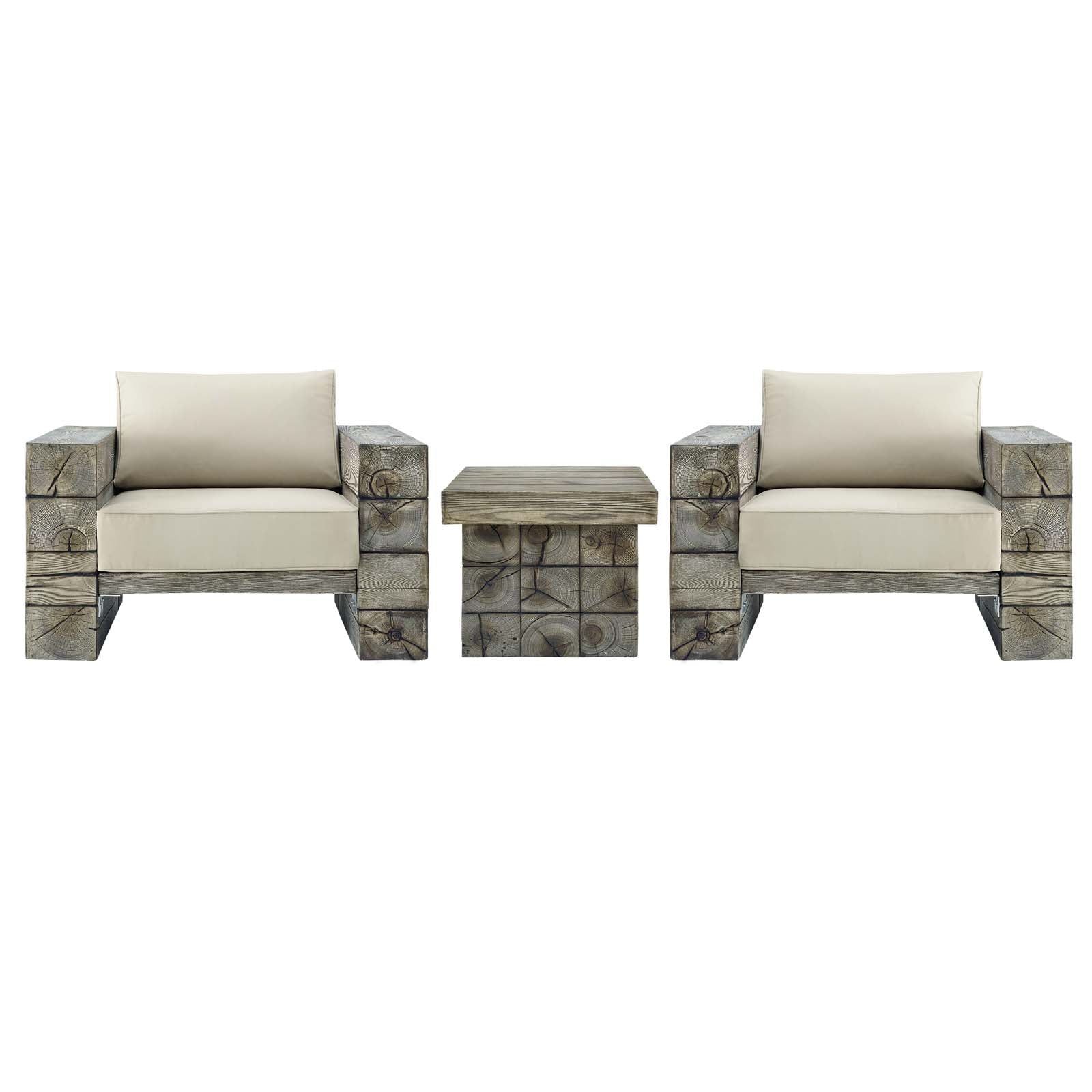 Capture a lakeside or cabin setting with the Manteo Outdoor Patio Arm Lounge Chair Set with Side Table. Solid magnesium oxide molding coated with a simulated driftwood finish creates a stylish and sturdy patio set of chairs and side table. Lounge Chairs are complete with generously padded all-weather cushions so you can enjoy your outdoor leisure time at your backyard, deck, lake house, patio, poolside, or porch. Equipped with non-marking foot caps and a protective cover, this comfortable outdoor set will update your patio decor with a rustic modern feel.