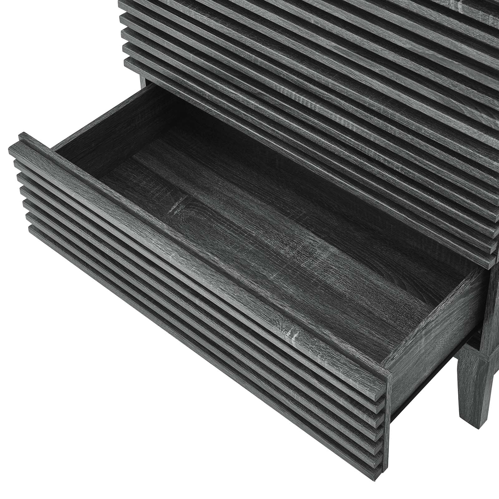 Tap into mid-century aesthetics with the Render Dresser Chest. This 5-drawer dresser chest features a durable particleboard frame with a smooth walnut wood grain laminate, four tapered wood legs, and full-extension glide storage drawers. Five spacious drawers offer ample storage space to keep clothes and bedroom essentials neat and organized. Boasting a mid-century modern style, this dresser features a solid construction with a pleasing look and practical functionality that's perfect for the bedroom.