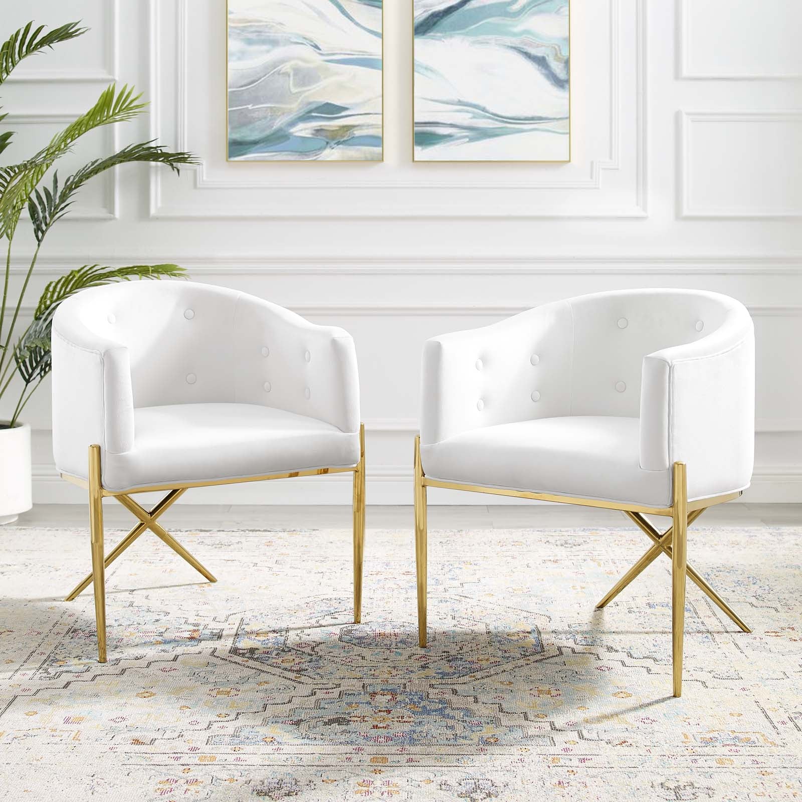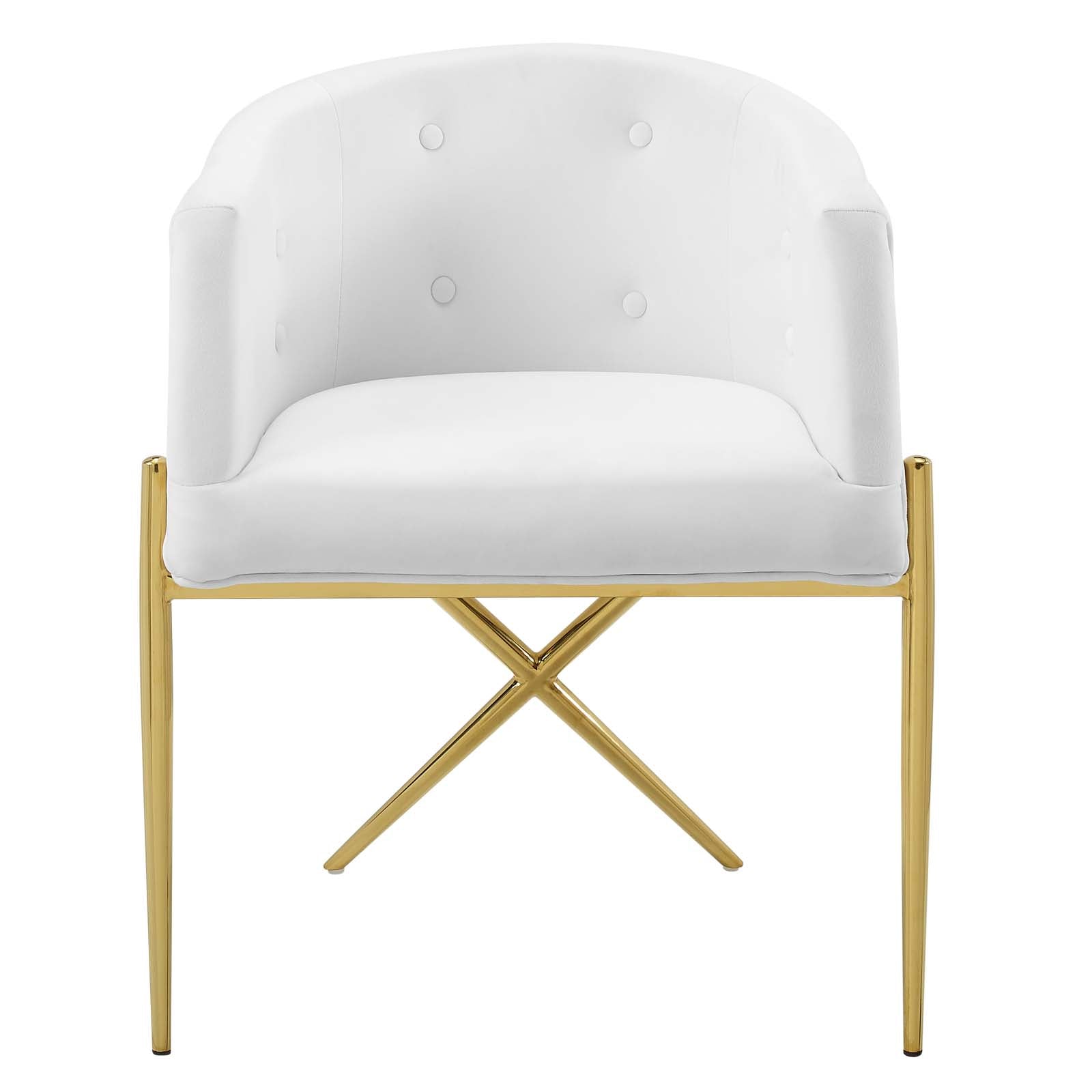 Bring luxe elegance to your dining room or living space with the Savour Tufted Performance Velvet Accent Dining Armchair. Featuring a sweeping silhouette and updated club chair design, this velvet chair is suited for the dining table or living room, entryway, bedroom, or office as an accent chair. This dining chair is upholstered in stain-resistant performance velvet upholstery and features dense foam padding to offer a comfortable seat while dining, working, reading, or relaxing. Resting on a chrome gold tubular stainless steel frame, this versatile accent chair has interior button tufting and a charming curved shape.