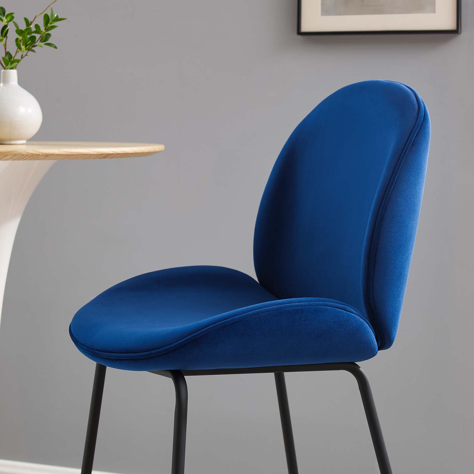 Breeze into vintage glamour decor with the whimsical Scoop Bar Stool. Supported by a splayed black powder-coated steel frame, Scoop comes with a soft, stain-resistant performance velvet upholstery for a unique addition to a bar-height table or kitchen counter. Padded in dense foam, Scoop features simple curves and a sleek, minimalist frame that combine to deliver a modern bar stool perfect for all your bar-height needs. Complete with a footrest and non-marking foot caps, transform your kitchen decor today with this cheerful and elegant bar-height stool.