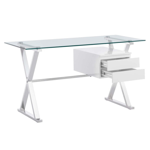 Resting on a polished stainless steel X frame, this computer desk is complete with a tempered glass tabletop and two sets of floating full-extension drawers that offer ample storage space for all your office essentials. Inspiring focus and productivity, this writing desk is ideal for the office, college dorm room, or any workspace. Includes non-marking foot pads to protect flooring.