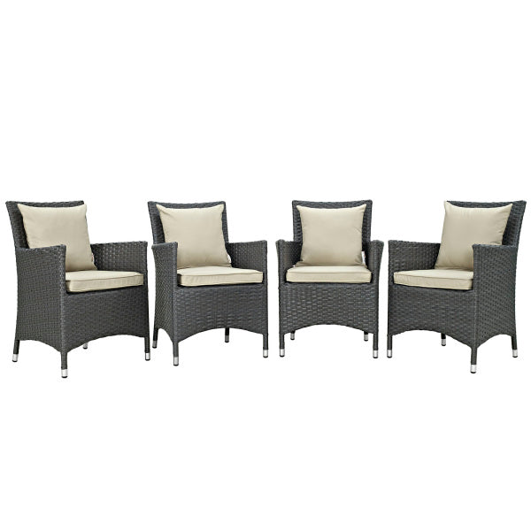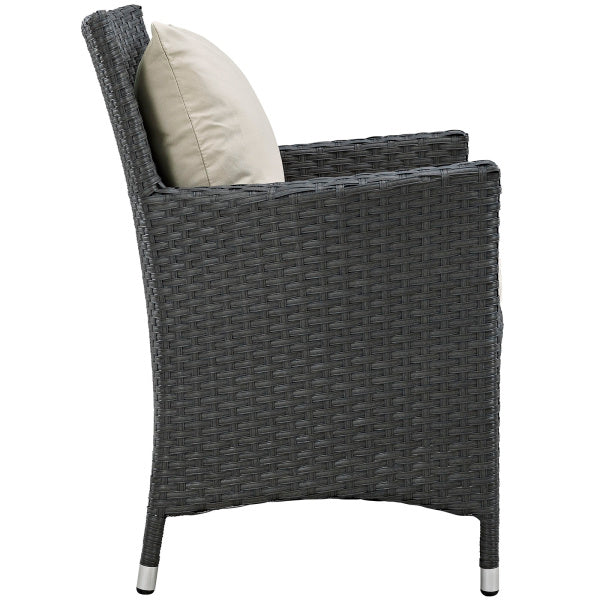 Outfit your patio with an imaginative outdoor sectional series of exceptional quality. The Sojourn series offers a robust seating experience that easily rearranges according to usage. Outfitted with industry-leading Sunbrella® fabric cushions, synthetic rattan weave, UV protection, powder-coated aluminum frame, immensely enjoy your outdoor time with a series that enhances patio, backyard, or poolside areas. This installment of the series is an Outdoor Patio Dining Set.