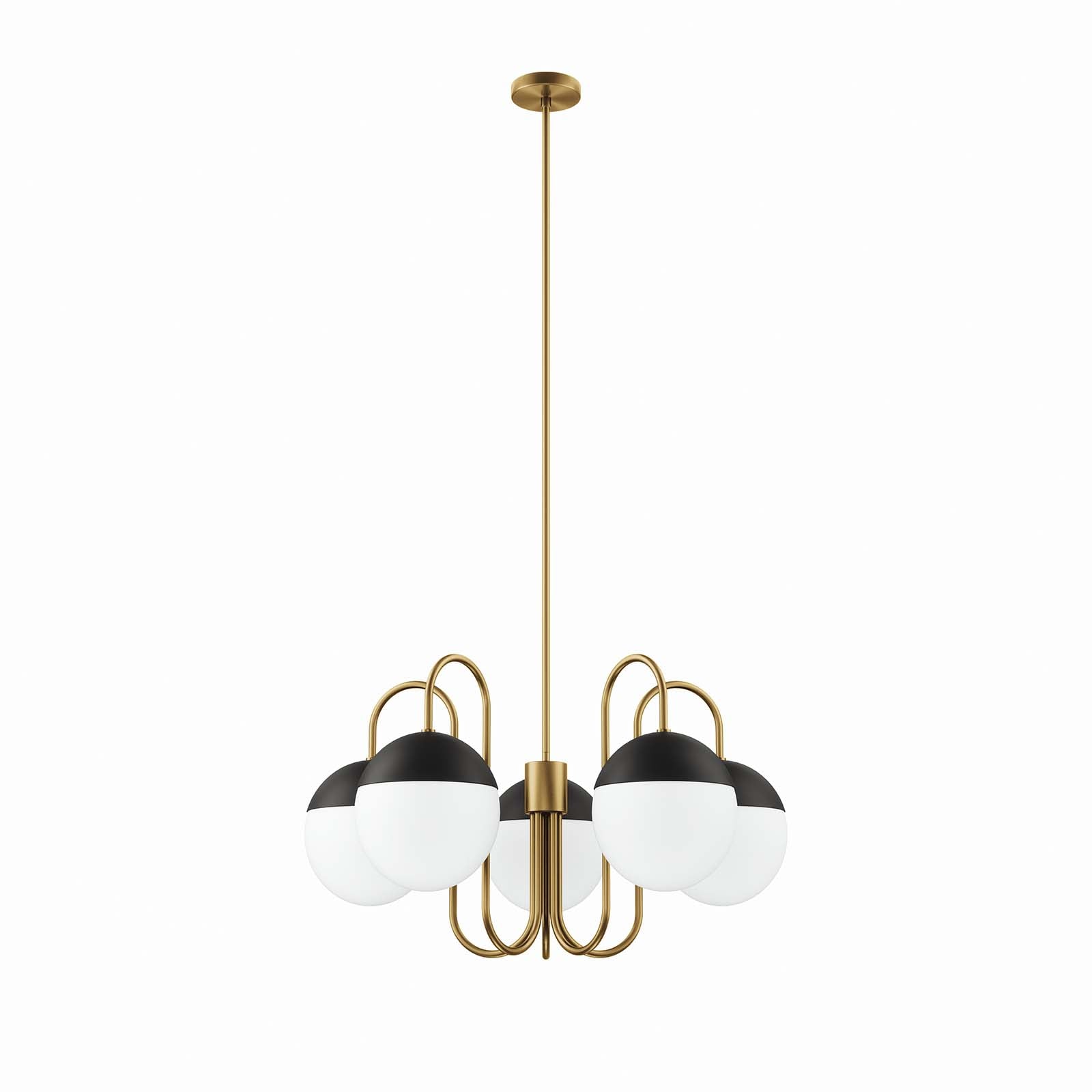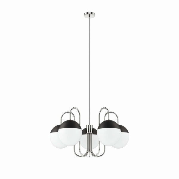 Cast a warm, ambient glow around your home or apartment with the Stellar 5-Light Chandelier. Adding contemporary charm to an entryway, kitchen, dining room, bedroom, office, or other living space, this spherical light fixture features frosted glass shades that attach to matte black metal bases.