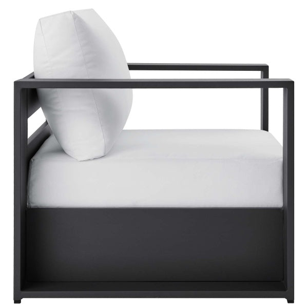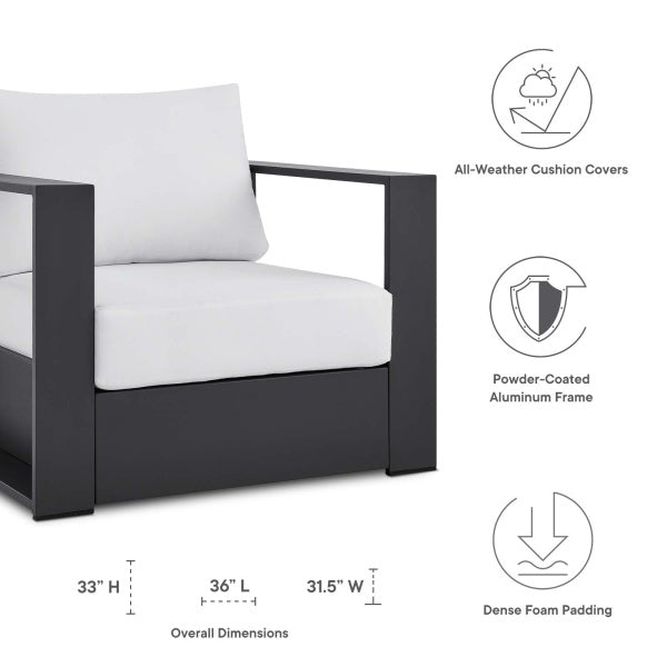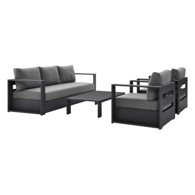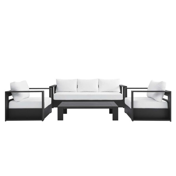 Enliven your alfresco spaces with the Tahoe Aluminum 4-Piece Outdoor Patio Set. This modern outdoor patio set includes two armchairs, a sofa, and a coffee table, crafted with durable powder-coated aluminum, dispensing contemporary elegance in your outdoor lounge spaces. The Tahoe 4-Piece Patio Set is perfect for poolside lounging with a sunproof, water-resistant fabric-covered seat and backrest. With dense foam padding for sustaining comfort and removable, stain-resistant cushions on the sofa and armchairs, this patio set is low maintenance and high performing. A durable patio set, Tahoe comes with easy-to-follow assembly instructions and features non-marking foot glides to protect your deck or patio floor. Weight Capacity - Chair: 331 lbs. Sofa: 993 lbs. Set Includes: One - Tahoe Powder Coffe Table One - Tahoe Powder Sofa Two - Tahoe Powder Armchair