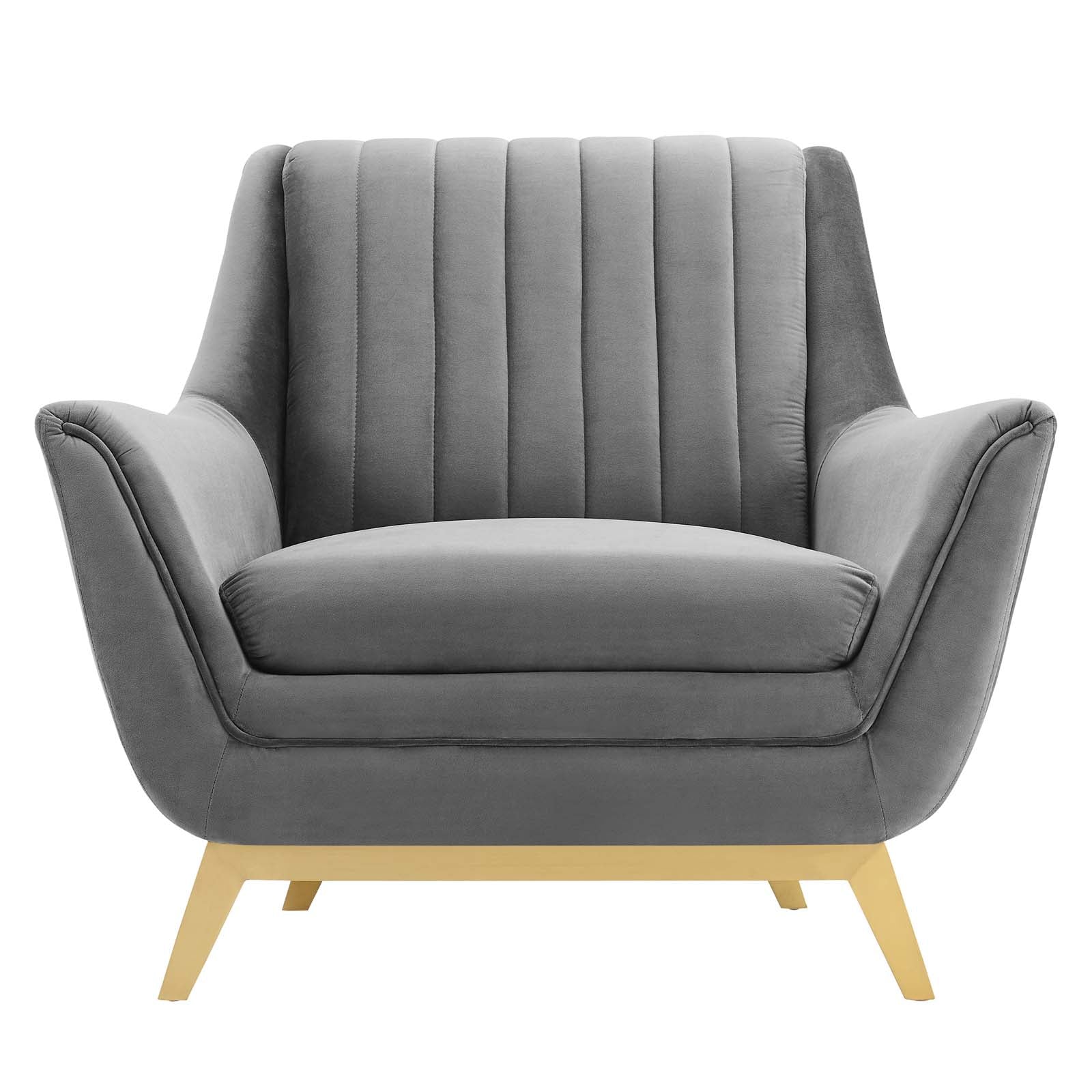 Bring rich tactiles and vintage modern charm to your living space with the Winsome Channel Tufted Performance Velvet Armchair. Putting a glam deco twist on a classic mid-century modern design, this accent chair features vertical channel tufting on the backrest, gold metal detail, and a flared silhouette. Covered in stain-resistant performance velvet, this upholstered armchair is padded with dense foam and complete with a no-sag pocket coil spring support system. With a solid wood and plywood frame, this velvet chair rests on gold stainless steel legs with plastic foot glides and supports up to 300 lbs.